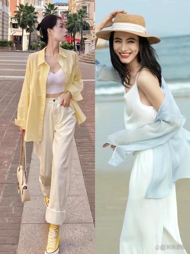 这里大家可以借鉴一下时尚博主的穿搭,叠搭衬衫或吊带背心,都能大大提升穿衣效果。
