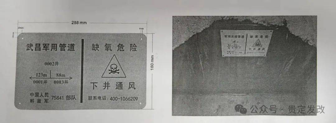 管道光缆是指敷设在既设通信管道中的光缆,常见于城市地区。通信管道采用混泥土、石棉水泥、钢管、塑料管等材料建设,安全度较高,光缆敷设环境较好。其警示标志包括警示牌、地面标识牌和人井(手孔)标识。警示牌采用具有反光功能的塑钢或PVC材质制作,主体采用红白油漆喷绘并粘贴反光膜,内容主要是保护通信线路的有关要求、宣传标语、联系电话等信息。地面标志牌采用不锈钢或橡胶材料制作,红底白字,内容主要包括宣传标语、路由指向、联系电话等信息。人井(手孔)标识印有红色文字和黄色提示标志,内容包括管道名称(xxx管道)、人井编号、井距、联系电话、缺氧危险警示标志等。