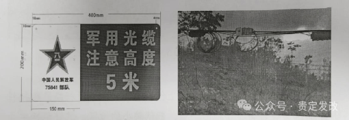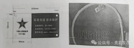 人井(手孔)中的管道光缆的架空光缆均悬挂(捆绑)有光缆标识牌,左侧为白底,中央绘制红色五角星,内标黄色“八一”字样,下方标注维护部队代号;右侧为红底黄字,内容为维护部队代号、缆线编号、缆线程式、宣传标语、联系电话等信息。
